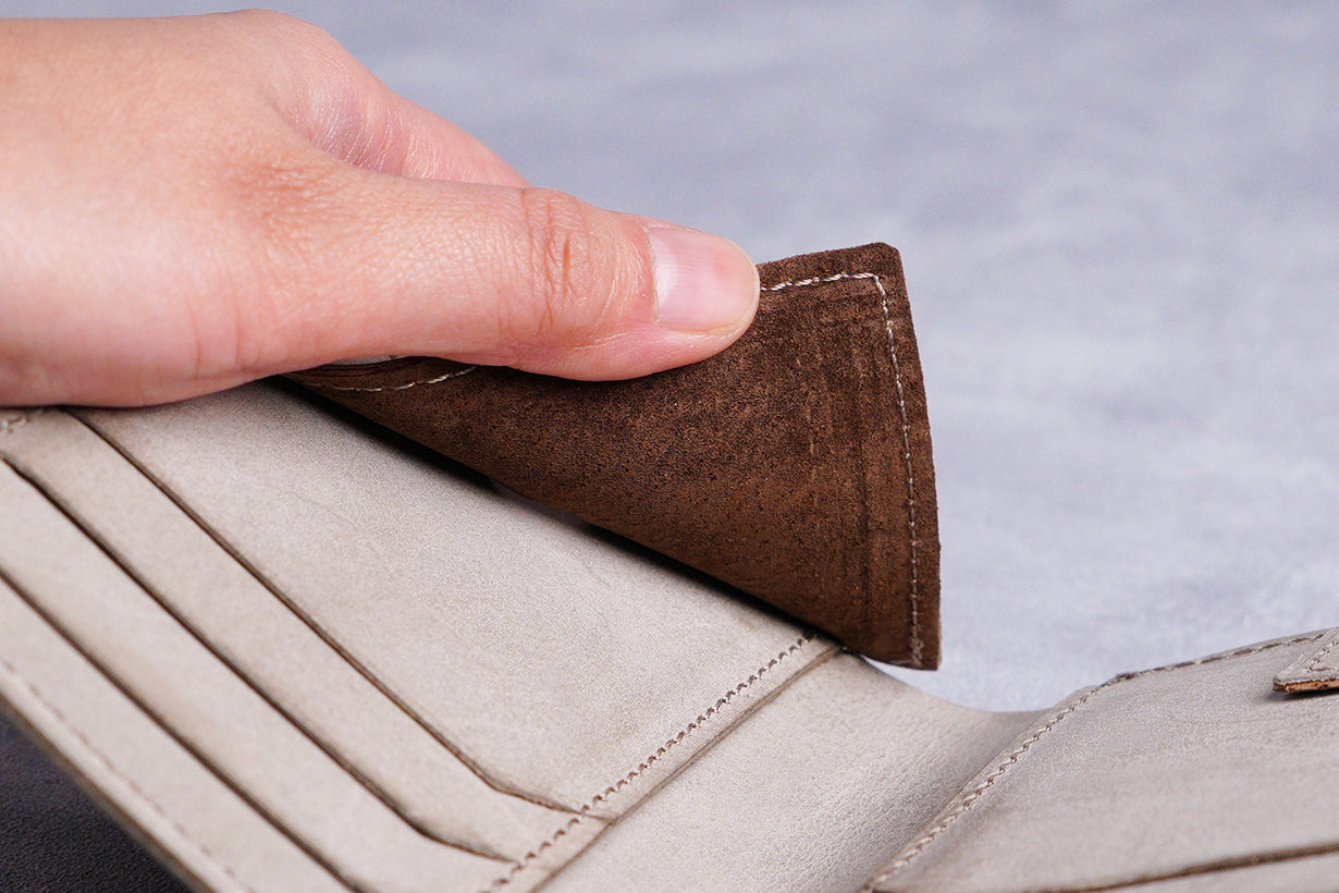 クリップの裏には上質なピッグスエードを使用。毛羽立ちが摩擦を生み、紙幣やレシートがズレにくい構造です。